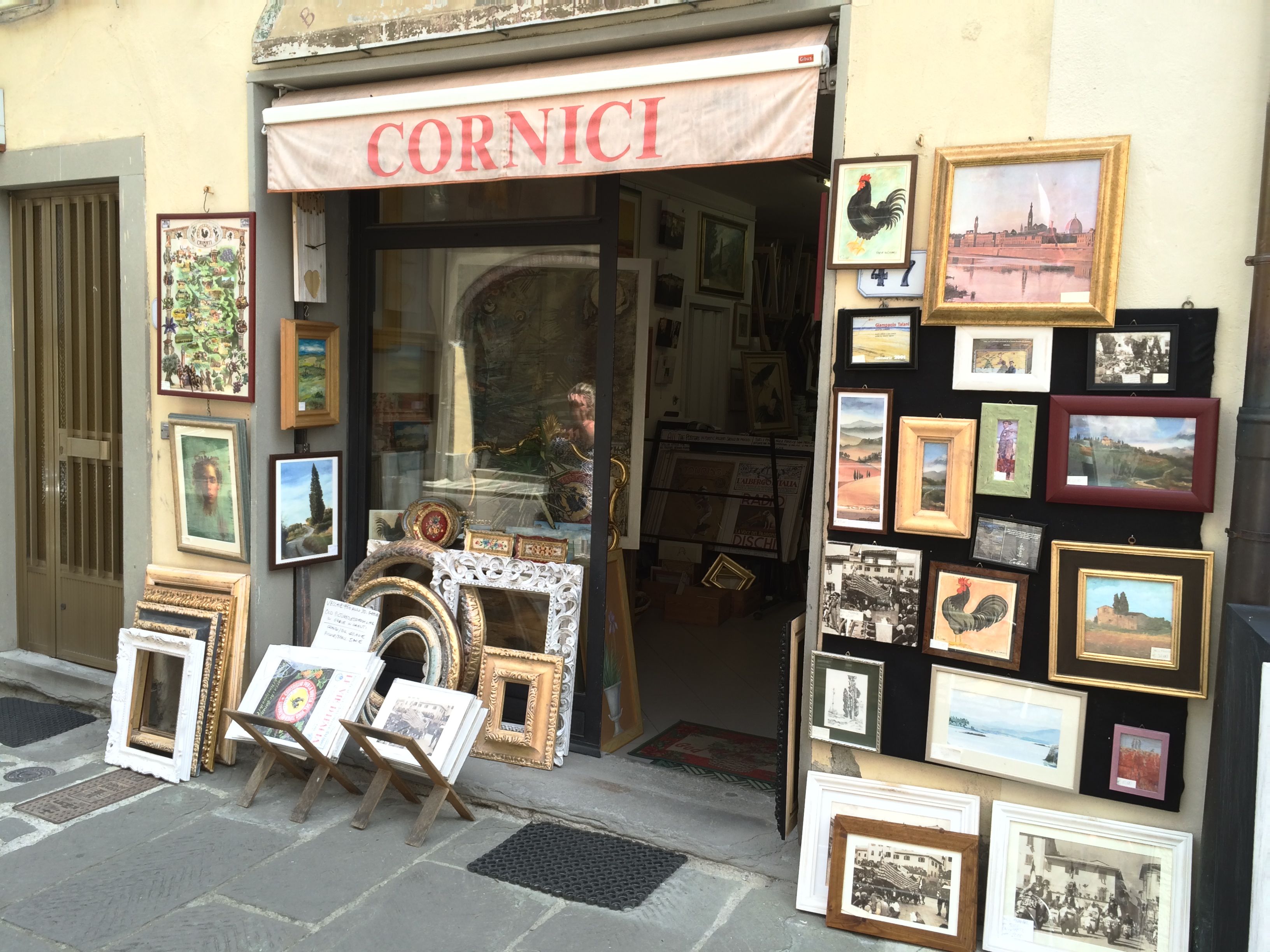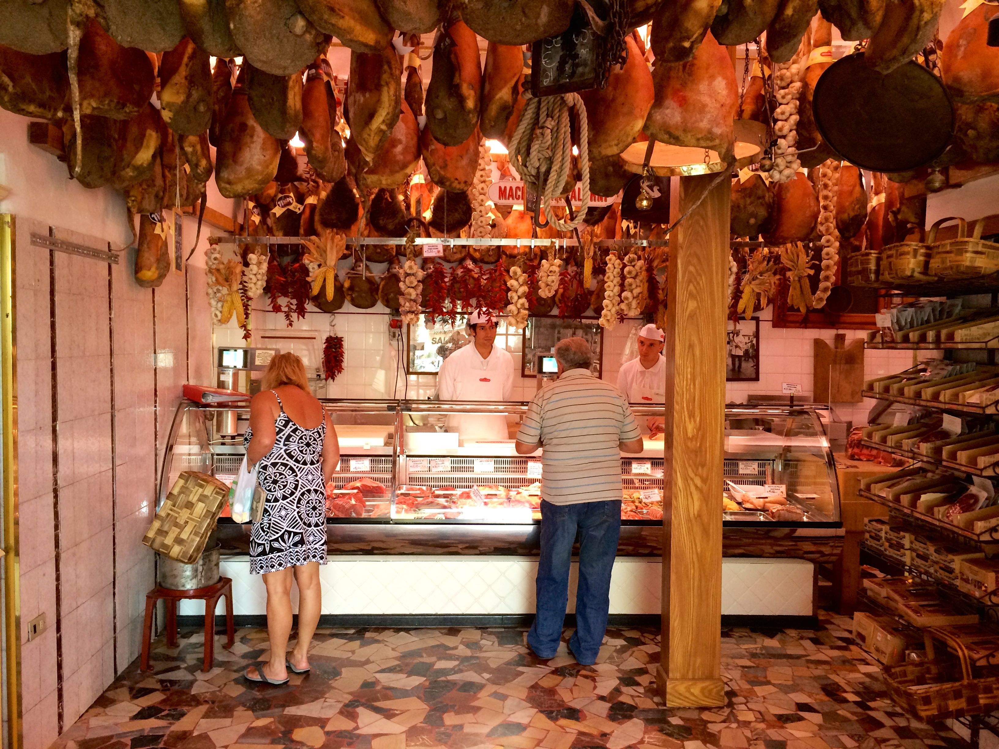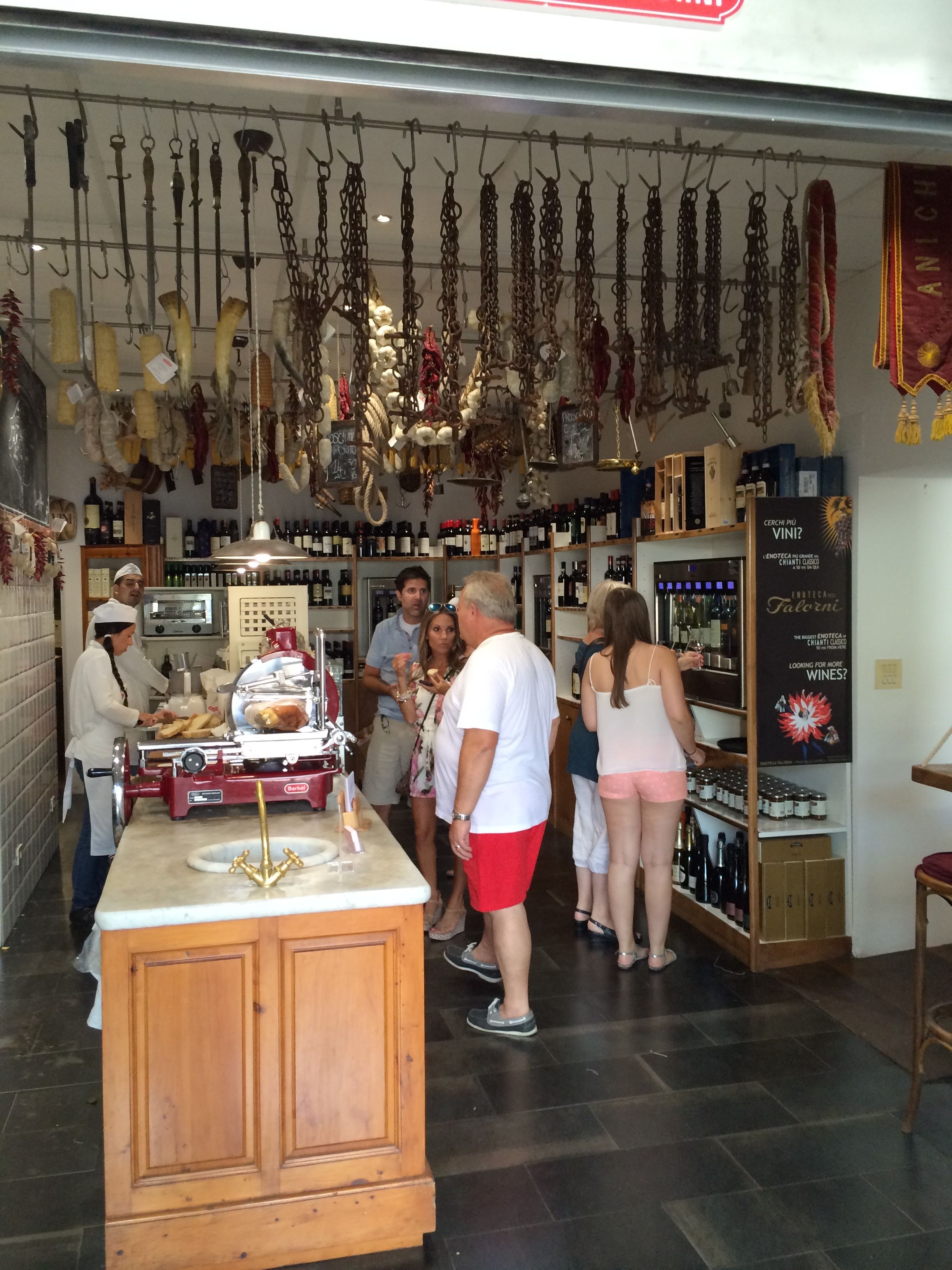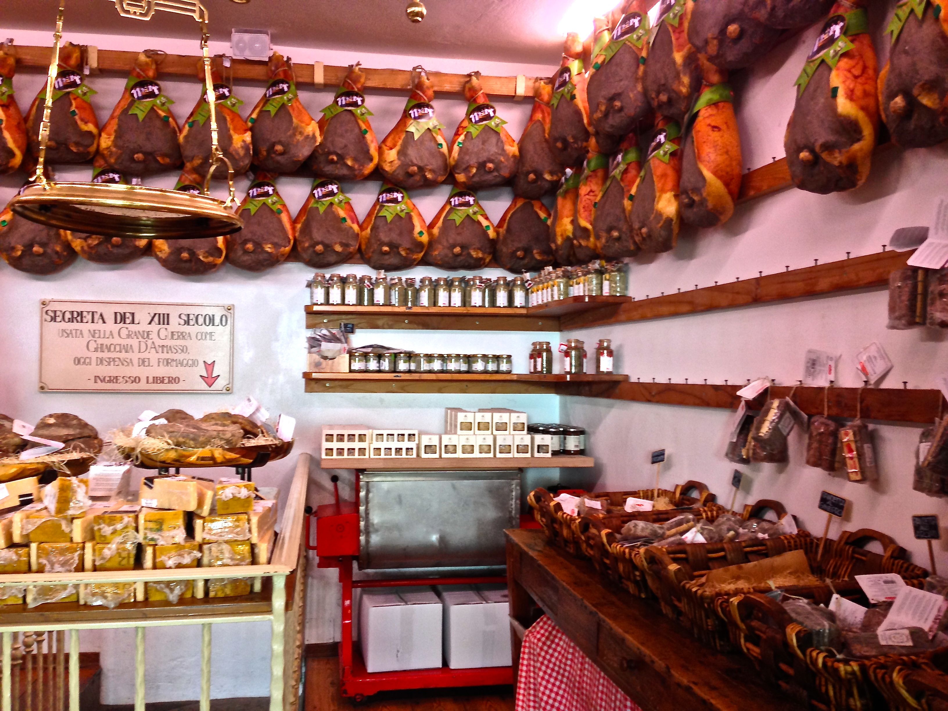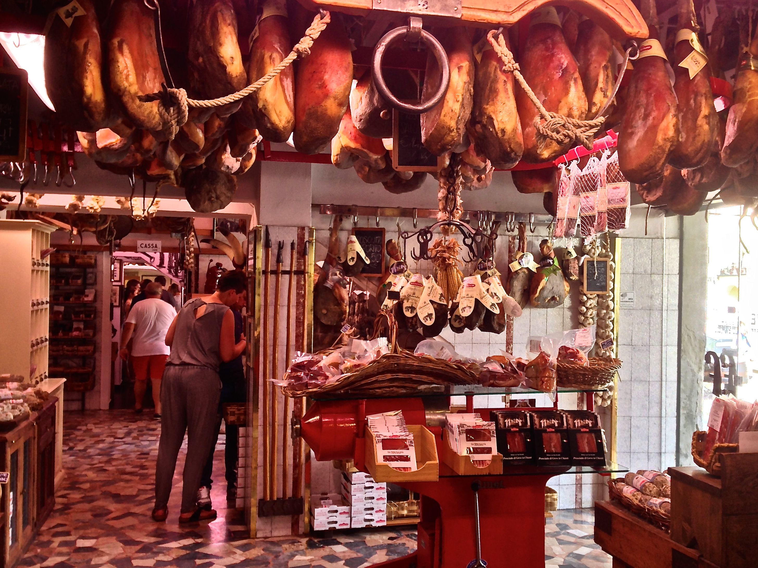 Back to Greve in Chianti, the town square is lined with many shops. They sell art, products from Chianti, which include wine, olive oil and balsamic vinegar. One such shop specializes in ham and pork and takes up three storefronts. There are hundreds of hams hanging from the ceiling waiting to be purchased by carnivores.