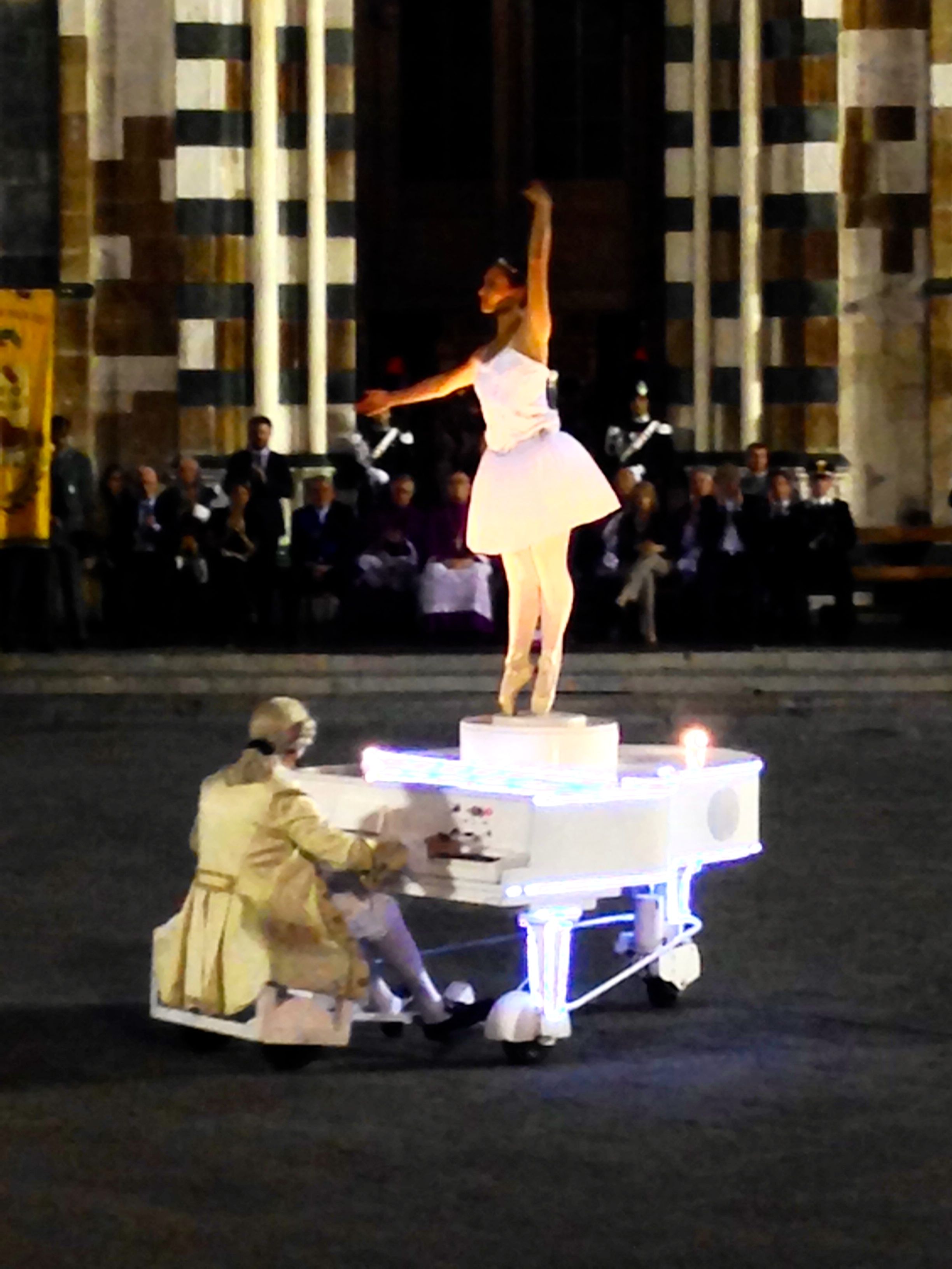 Since we didn’t arrive two hours early to get a seat in the temporary grandstands, we walked around for quite awhile, and decided to try to snag a seat. We could only find a place to stand on the stairs the led up to the grandstand, so we took our place. Believe us, it was very hard to “keep our place” the entire night, as people walked by and tried to force their way in and on us. It was jammed to the max with people. We of course thought standing for about two hours would be nothing…… little did we know that this “procession” was REALLY going to take four hours!!!!