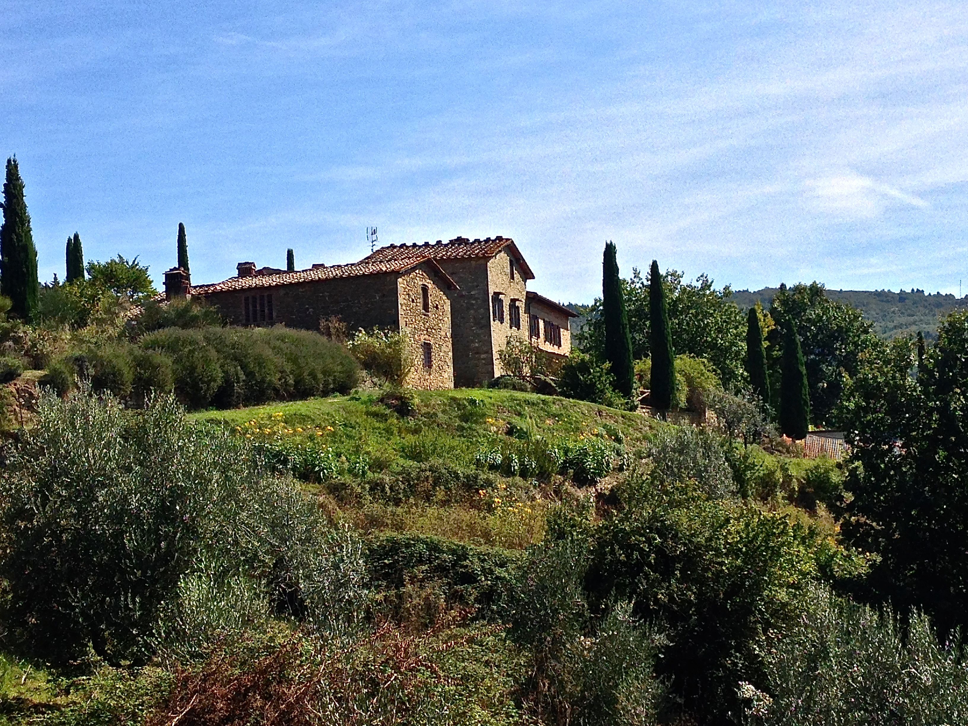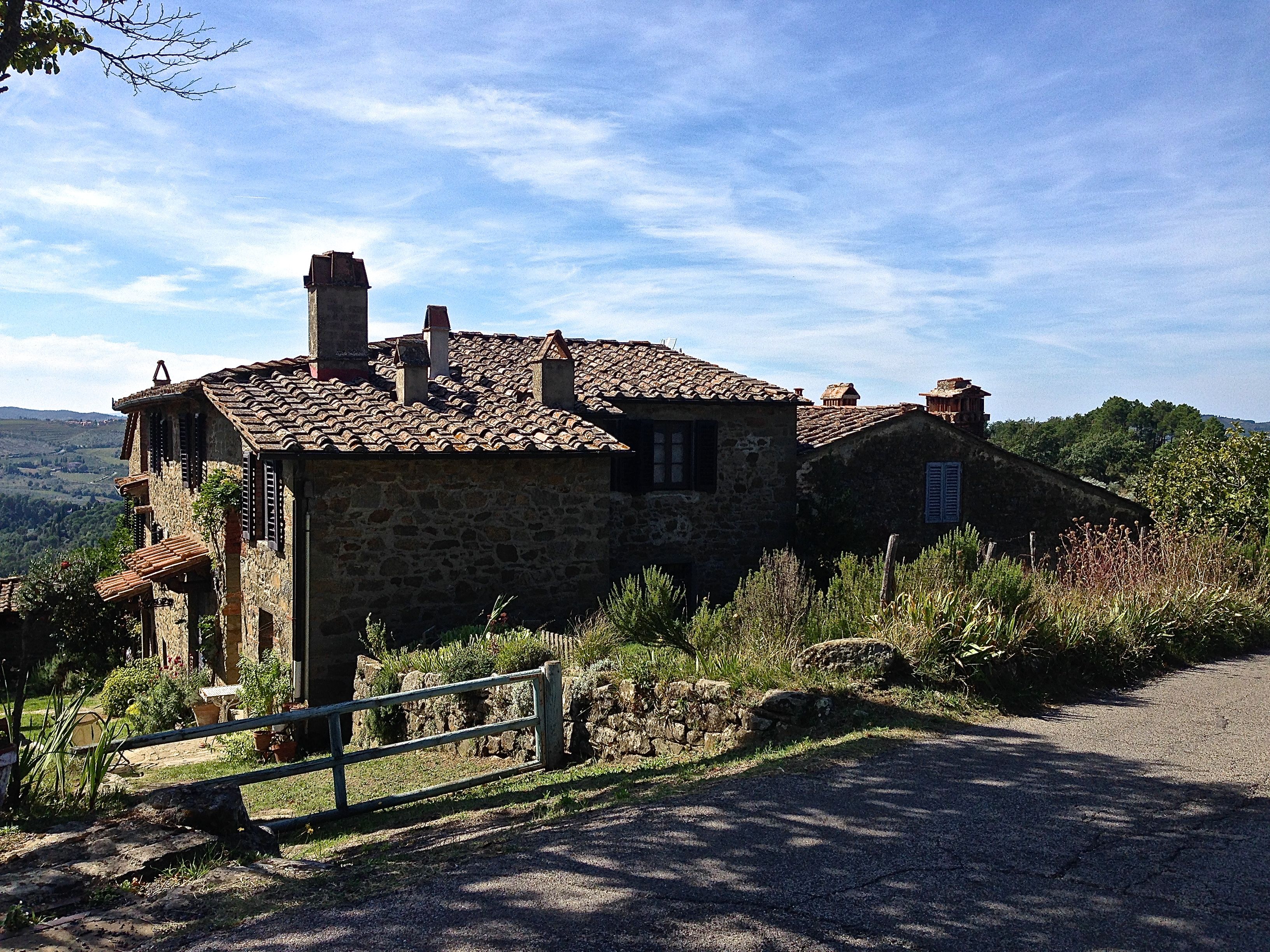 With our stay in Greve winding down, we revisited Lamole in the daytime to see the view. You will remember that the last time we visited Lamole for a dinner, I got lost, thanks to GPS, and Rita has not let me drive since because I raced to make our dinner reservations 45 minutes late. The daytime drive to Lamole was beautiful, and slower, we had great views to Panzano and we thought we could even make out San Gimignano in the distance some 27 kilometers or 16.777 miles away.