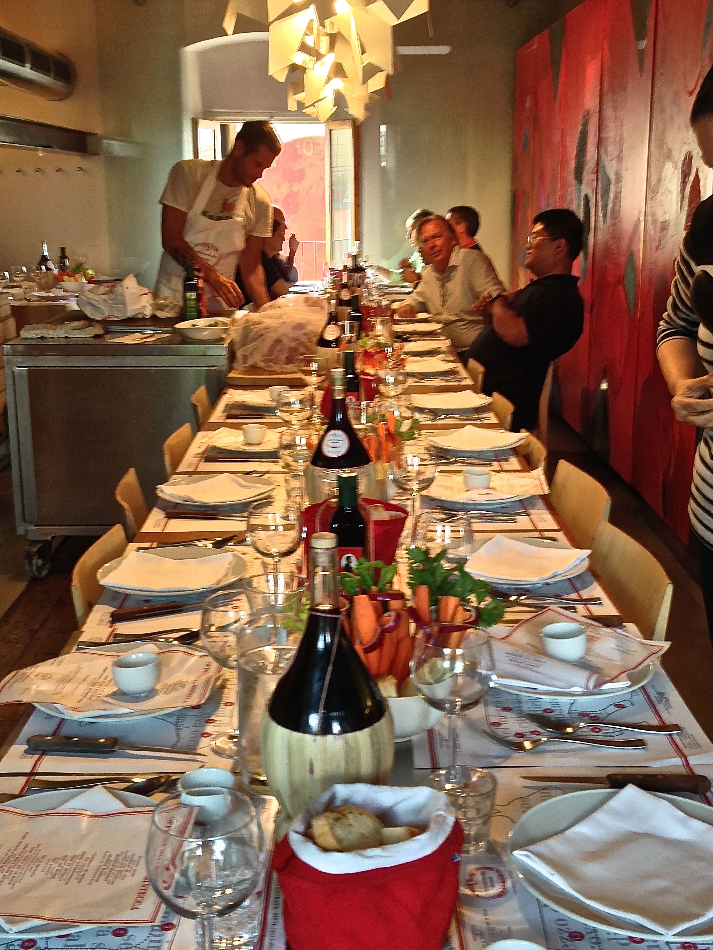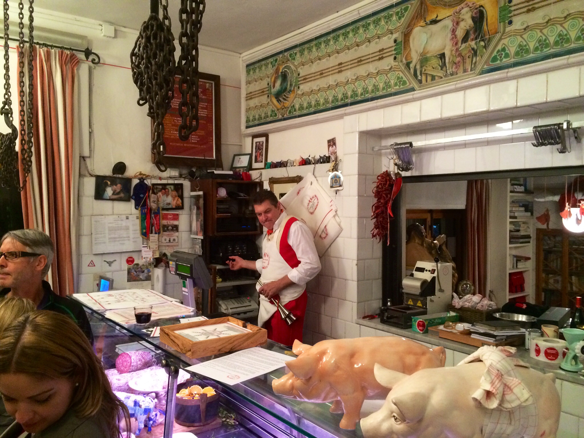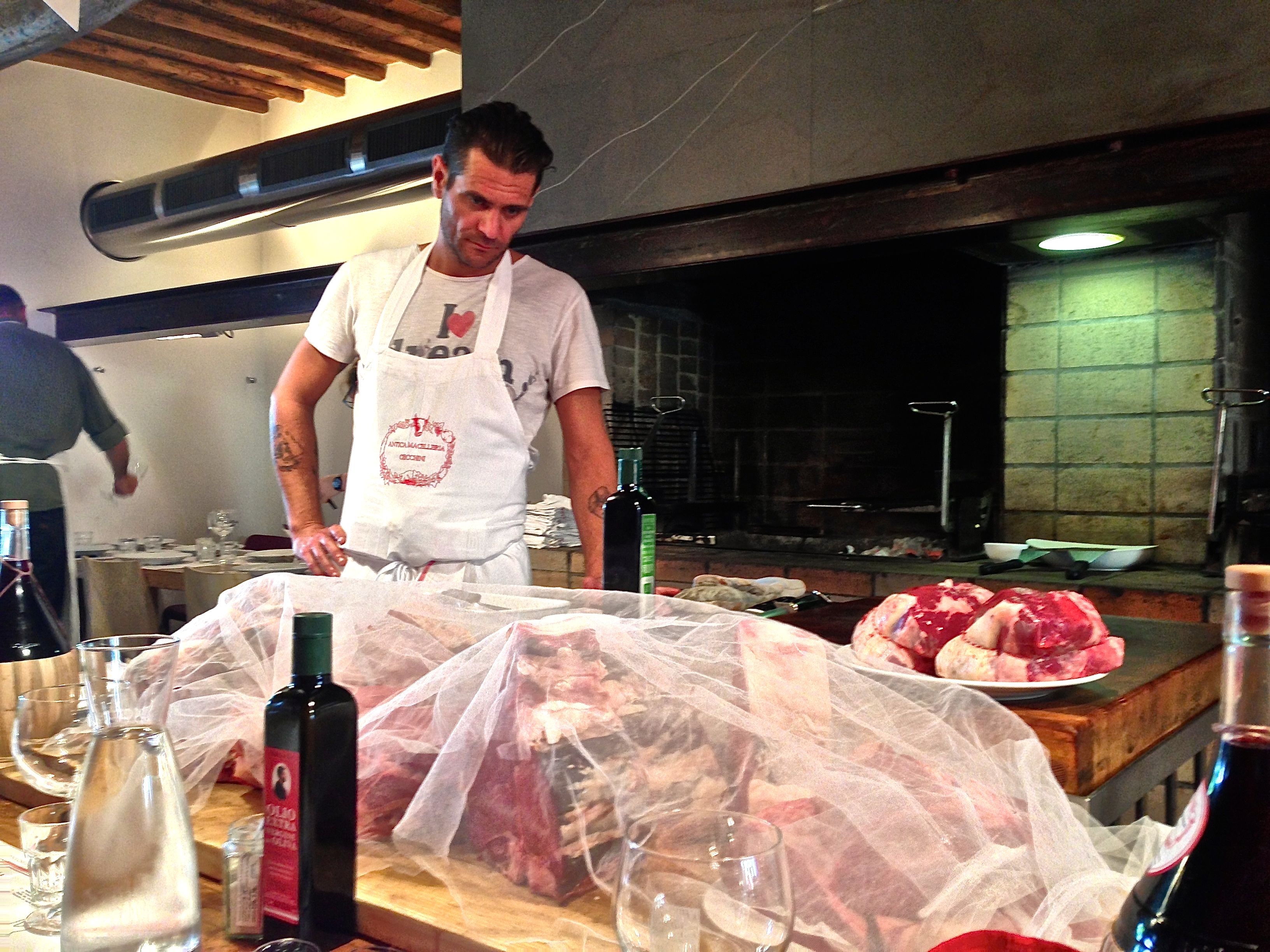 We also returned to Panzano yesterday, to eat at Dario’s Officina Della Bistecca. Wow!!!! He is a showman. The meal starts with appetizers in the butcher shop, blaring rock music and Dario, himself, holding court. Then, the group of about 20 plus moved upstairs to a dining room which has a wood burning grill. Once seated, the king of BEEF, starts the meal that consists of, what else, beef! There are 5 courses including beef tartare, rump steak, panzanese steak, rib-eye steak and T-bone steak. Everything, except the tartare, is grilled before your eyes. The beef was cooked as huge chunks of beef. The largest I have ever seen. As they take each course off the grill to serve, a guy comes out of the kitchen, holds the meat high over his head and chants something in Italian at the top of his lungs, I assume blessed is the king of meats, BEEF, and “TO BEEF OR NOT TO BEEF” and may all enjoy our cooking!!! Bon appetit!